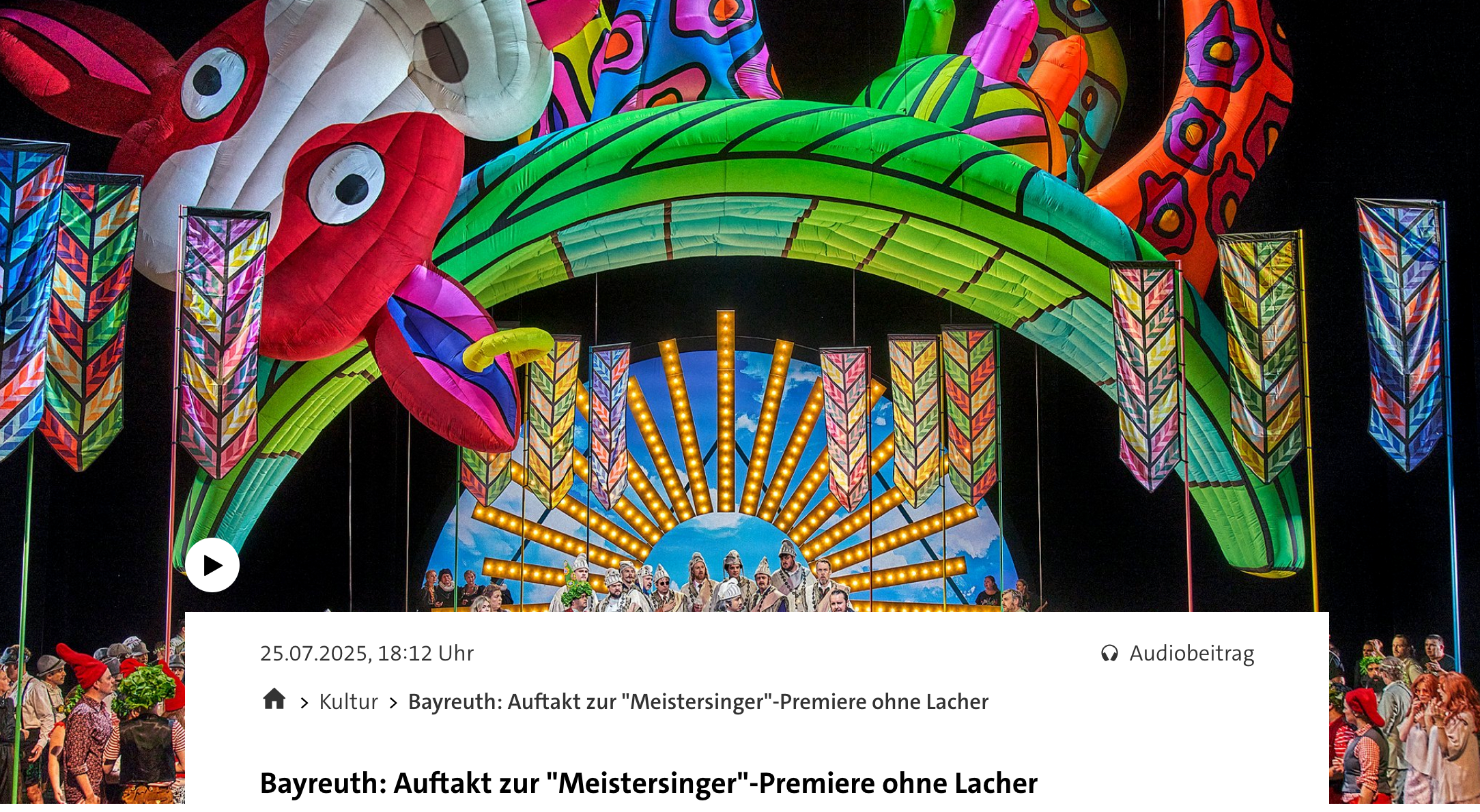Ausverkauft, die Stimmung ist festlich und heiter. Bei Richard Wagner /Meistersinger, endlich mal anders. Und schon im Rahmen Bayreuths für R. Wagner ein Reinfall gegen ihn selbst