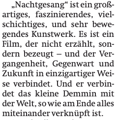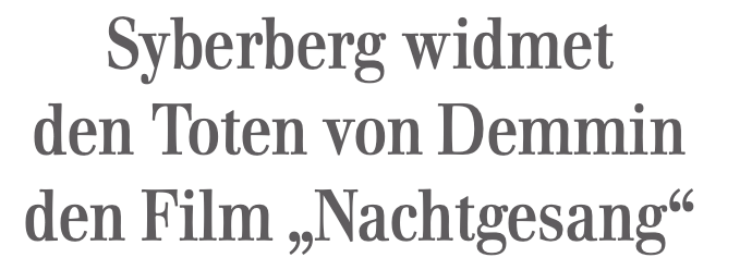 Dieser Film aber gehört zu Installationen in Demmin selbst in vergangenen Jahren mit den Versuchen die Stadt nochmal im Zentrum wieder herzustellen, aus eigener Initiative und als Film so dort vorgeführt vor jetzt 2 Jahren, als Gesänge aus Demmin, dass alles ein Ganzes wurde mit Anfang, Ursachen in der Geschichte und Folgen bis heute. Vor zwei Jahren noch teils unerkannt und als lächerlicher SchwanenGesang beschrieben, was heute als Phönix nun aus der Asche steigend erscheinen kann. Der Chor der Toten in ihrer Kathedrale aus Stimmen jeder Himmelsrichtung vor den Augen, die zusammenfügen, was versagt war, zu neuen Sinn. Zum Film geworden in jedem Haus. Aus einem kleinen Raum in Demmin am Ufer der Peene des toten Hafen sonst bunter Hass-Gesänge und voller Sexpuppen des 8. Mai als Befreiung zum Parkplatz für LKWs aus ehem. Urgestein preussischer Garnisionsgeschichte oder Hanse davor nun das Angebot