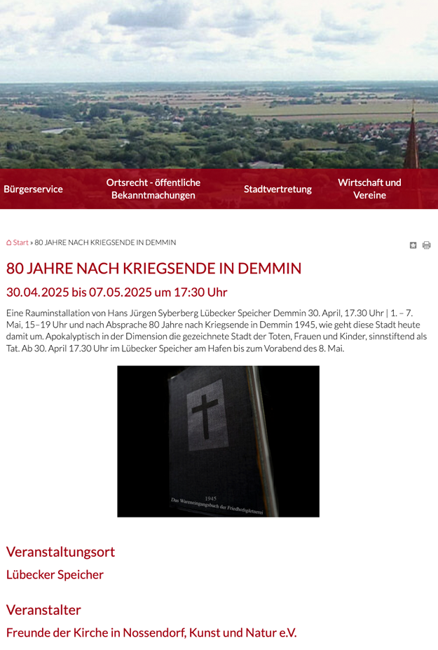 Das hat die Sorge mölgich gemacht, am schlimmsten Ausgang zu wissen wie und wo und was zu tun ist. In Demmin sicher die Entscheidung als alles unterging, Stadt und Menschen, sie Leere sich auftat, in der Mitte selbst, den Weg zu suchen mitten hindurch. Was Hölle war und Fluchten und Trauer durch Kälte und Notz, da anzusetzen, die Namen der Toten selbst zu rufen, dass sie leben nun ewiglich. Umgeben von der Musik die das möglich macht, Rahmen, der es erlaubt, zu danken nur so. Aller Einsamkeiten zum Trotz. In der Gewissheit, die das macht.