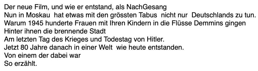 Und es kommt von hier aus diesem NossenDorf, wiederentstanden nach 80 Jahren, anders als vorher, und doch getreu dem Erreichten gegen die Welt aussen im Krieg wieder. Und so anders dieser Film, diesem Ort und Ereignissen gerecht zu werden. In unserem Auftrag. Wie von Euripides vorgezeichnet aus alt-biblischen Gezeiten. Mit selbsterforschten Mitteln. Von heute alles. Bis morgen.