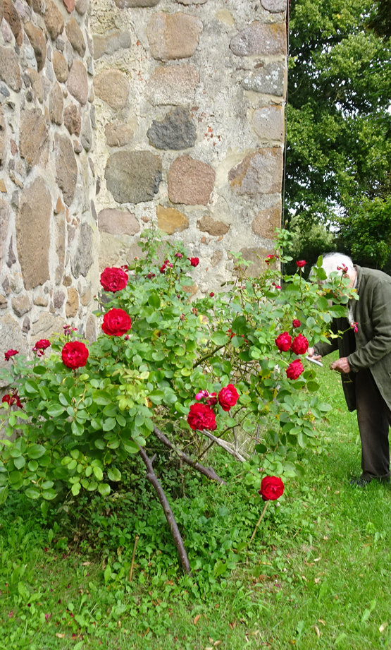 An der Kirchenmauer unter dem Turm, die Rosen schneidend als Dank für die neue Orgel in Nossendorf