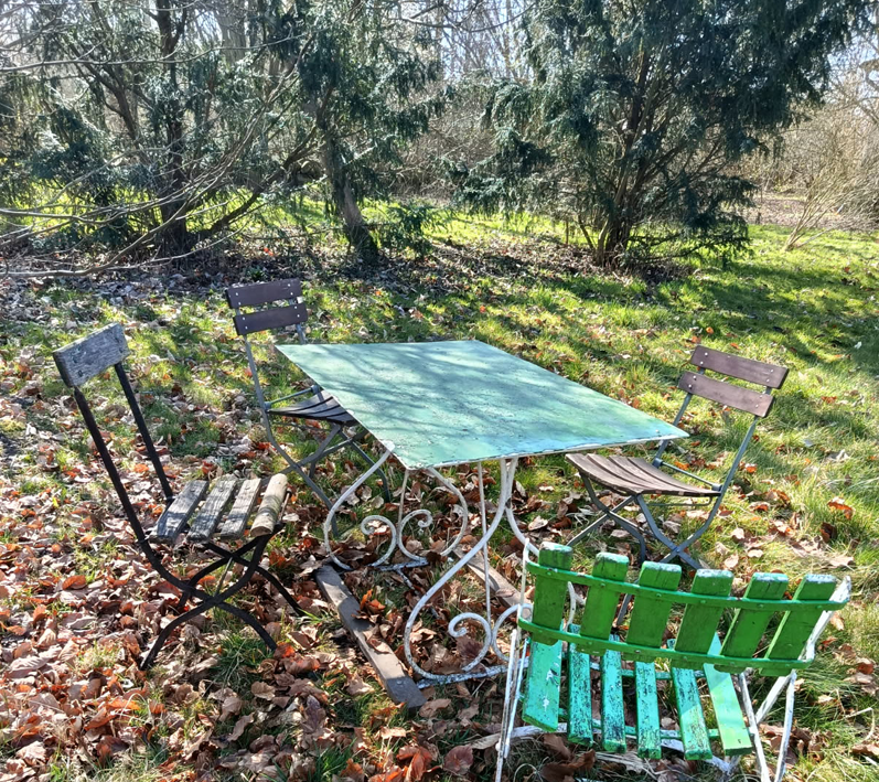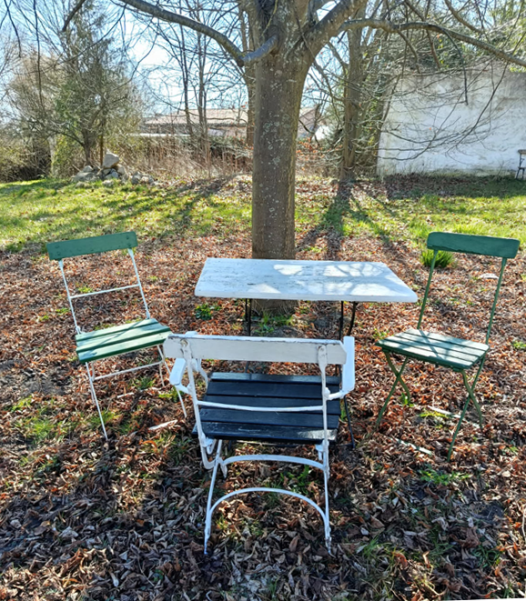 Tisch raus, Sonne, unter der Linde vor dem Haus