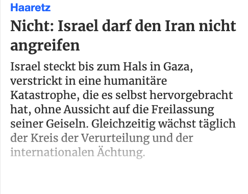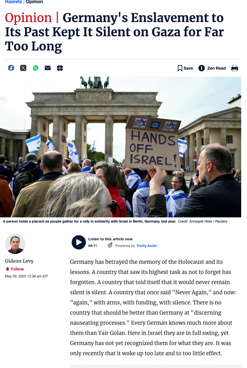 Deutschland hat die Erinnerung an den Holocaust und seine Lehren verraten. Ein Land, das seine höchste Aufgabe als nicht vergessen ansah, hat es vergessen. Ein Land, das sich selbst gesagt hat, dass es niemals schweigen würde, schweigt. Ein Land, das einst "Nie wieder" sagte, und jetzt: "wieder, mit Waffen, mit Finanzierung, mit Schweigen. Es gibt kein Land, das besser sein sollte als Deutschland, "Ekelprozesse abzulegen". Jeder Deutsche weiß viel mehr über sie als Yair Golan. Hier in Israel sind sie in vollem Gange, aber Deutschland hat sie noch nicht als das erkannt, was sie sind. Erst vor kurzem wimmelte es zu spät und zu wenig.