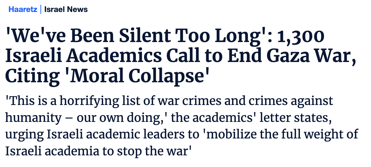 "Dies ist eine schreckliche Liste von Kriegsverbrechen und Verbrechen gegen die Menschlichkeit - unser eigenes Tun", heißt es in dem Brief der Akademiker, in dem israelische akademische Führer aufgefordert werden, "das volle Gewicht der israelischen Wissenschaft zu mobilisieren, um den Krieg zu stoppen".