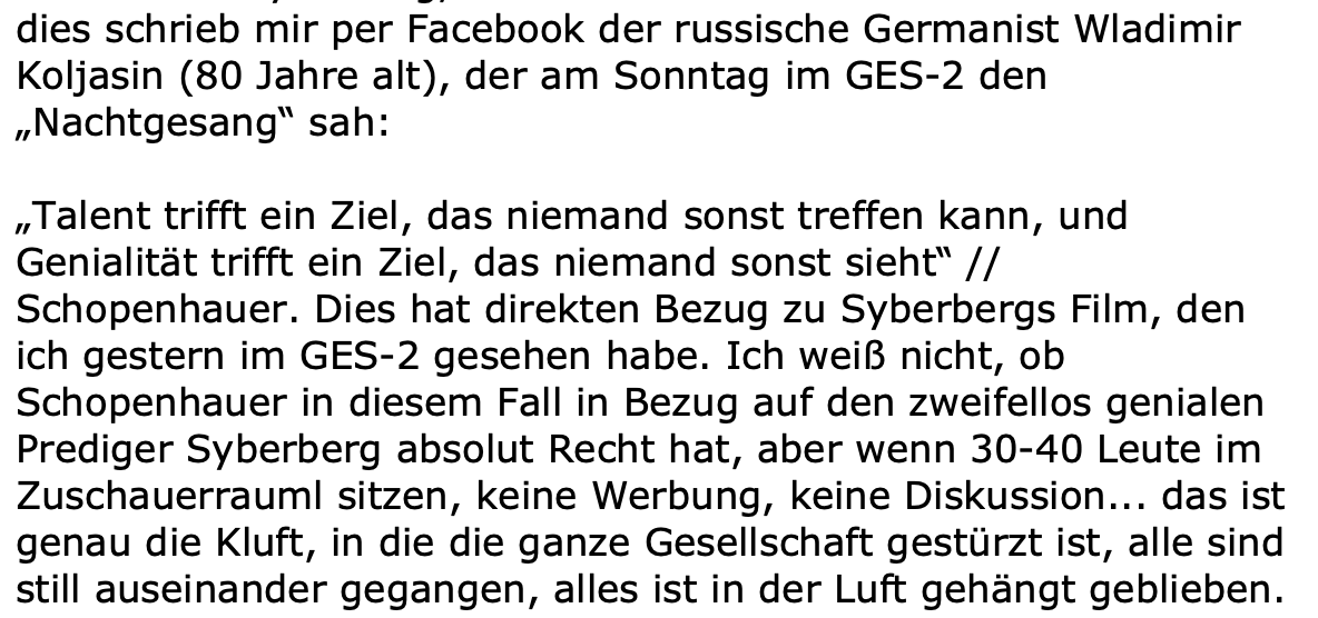 Wie der Film aus Deutschland, den sie aus den USA als Unseren H. annahmen und wie nun diese Demminer Gesänge zusammen mit seinem NachtGesang als Revolution of of a graet, bold German Epic mit den Ohren zu denken.