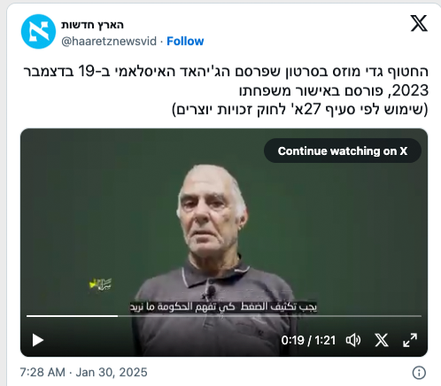 Die Familie des Gadi Moses hat die Veröffentlichung des Videos des Islamischen Jihad aus dem Dezember 2023 aus der Gefangenschaft zugelassen.