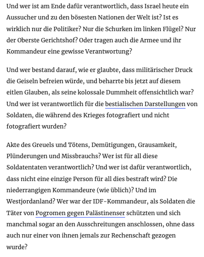 Er fährt fort: "Netanyahu, Gallant, Gantz und Herzi Halevi – achten Sie darauf. Diese Situation, in der wir jeden Moment sterben könnten, ist eine unerträgliche Situation, es besteht eine vernünftige Chance, dass wir heute Abend auch getötet werden, weil es keine Garantie gibt, dass unsere Armee uns nicht auch bombardiert. Wir sind in Gefahr und unsere Bombe könnte auf uns fallen. Es gibt das Gefühl, dass Sie uns nicht lebend nach Hause bringen wollen. Sie wollen Körper akzeptieren, um den Preis zu senken."