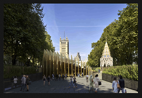 In London geplantes Holocaust-Mem. wie in den USA in jeder grösseren Stadt. Labyrinthe aus Beton auf dem grünen Grund gefällter Platanen.