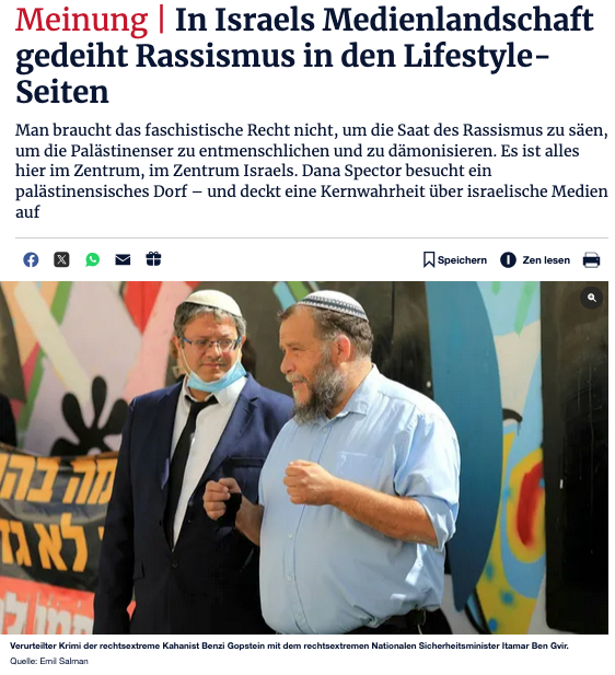 Ziemlich bald werden wir weit kommen. Man braucht das faschistische Recht nicht, um die Saat des Rassismus zu säen. Man braucht keinen Kanal 14, um Palästinenser zu entmenschlichen und zu dämonisieren. Es ist alles hier im Zentrum, im Zentrum Israels. Auf den Freizeit- und Funpages einer Zeitung.