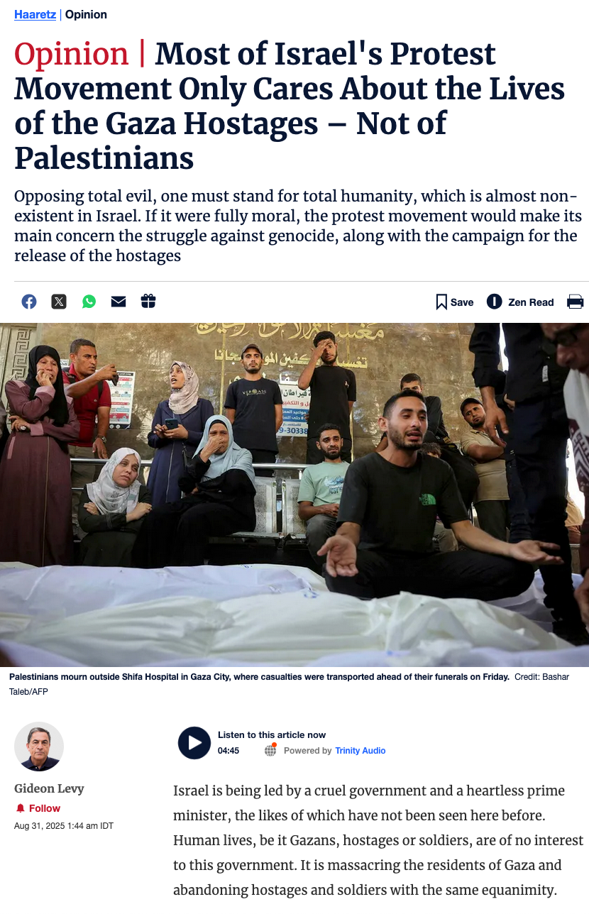 Israel wird von einer grausamen Regierung und einem herzlosen Premierminister geführt, wie sie hier noch nicht gesehen wurden. Menschenleben, sei es die Bewohner des Gazastreifens, Geiseln oder Soldaten, sind für diese Regierung nicht von Interesse. Sie massakriert die Bewohner von Gaza und hinterlässt Geiseln und Soldaten mit dem gleichen Gleichmut.