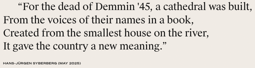 Denn der Film ist die Geschichten dazu heutiger Situation, wie dargestellt. in Ton und Bild. Wie sie zur Kathedrale werden aus den Namen der Toten von 1945 als Film am letzten Tag des Krieges in Demmin.