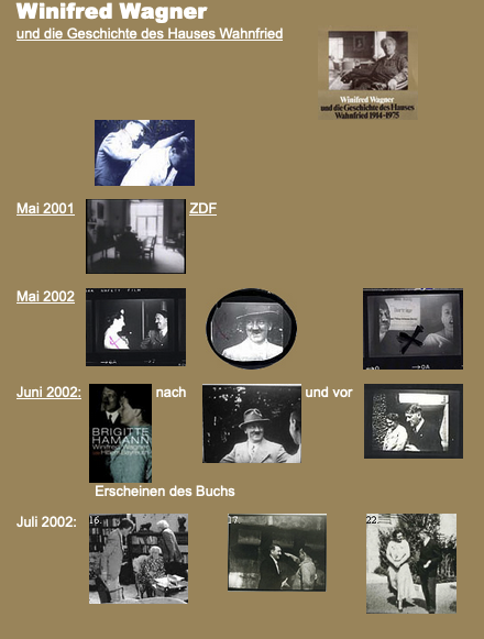 Was der Dialog mit Winifred Wagner nicht enthält, sind die Fotos zur Zeitgeschichte, wie sie zur Aufnahme heimlich auf dem Tisch lagen, insbesonders aus dem Film von Wolfgang Wagner mit Hitler selbst. Inzwischen separat dazu gehörend. Wie auf unserem Tagebuch aus N. Von jedem der kleinen Bilder führt ein