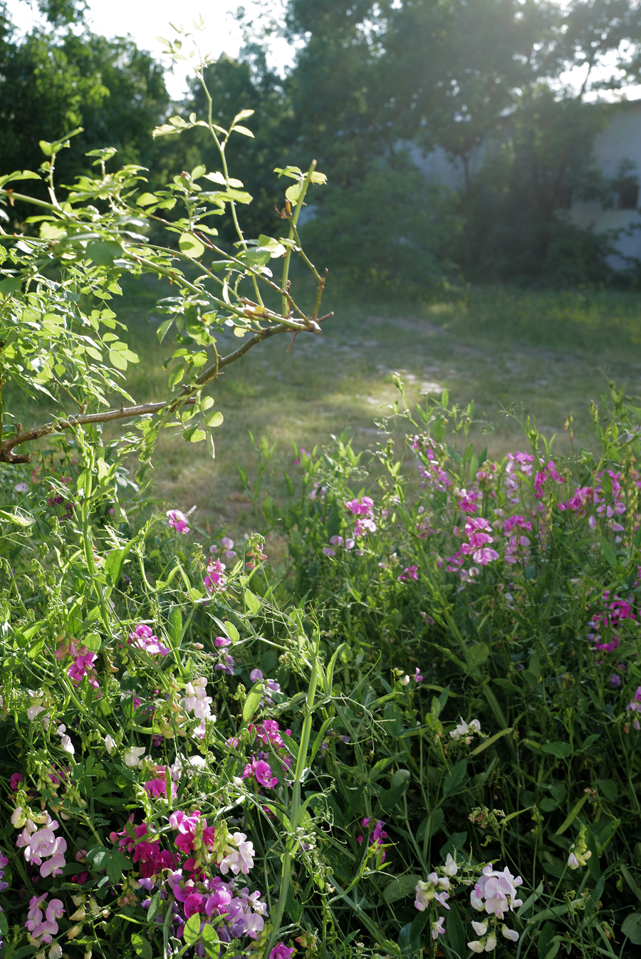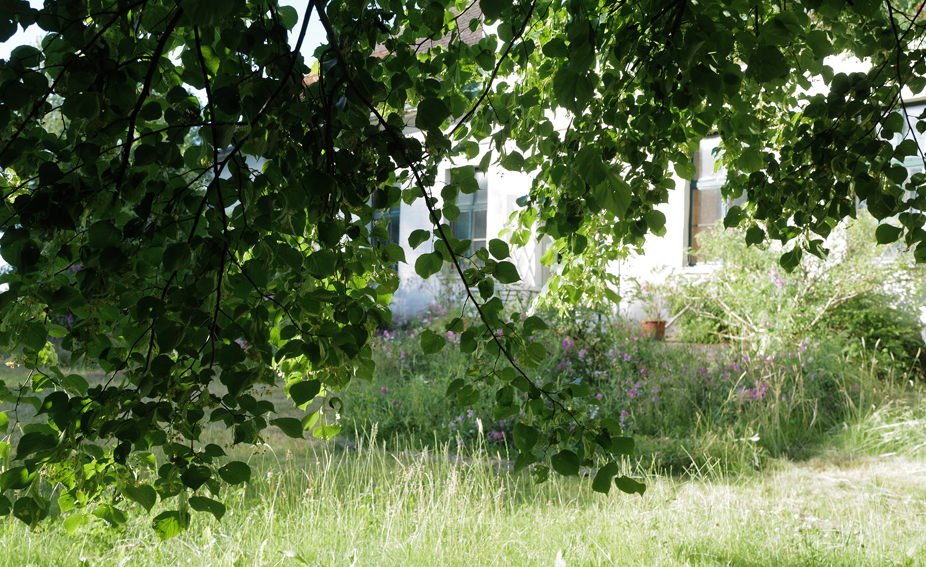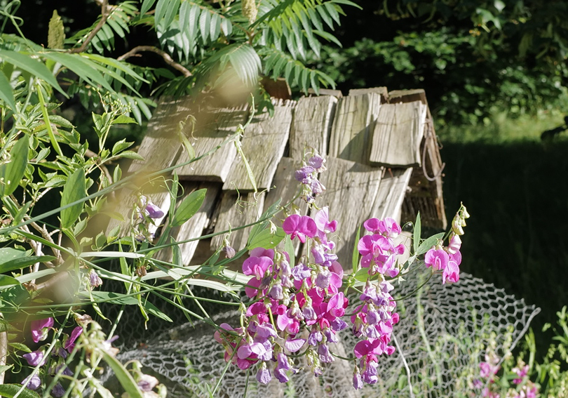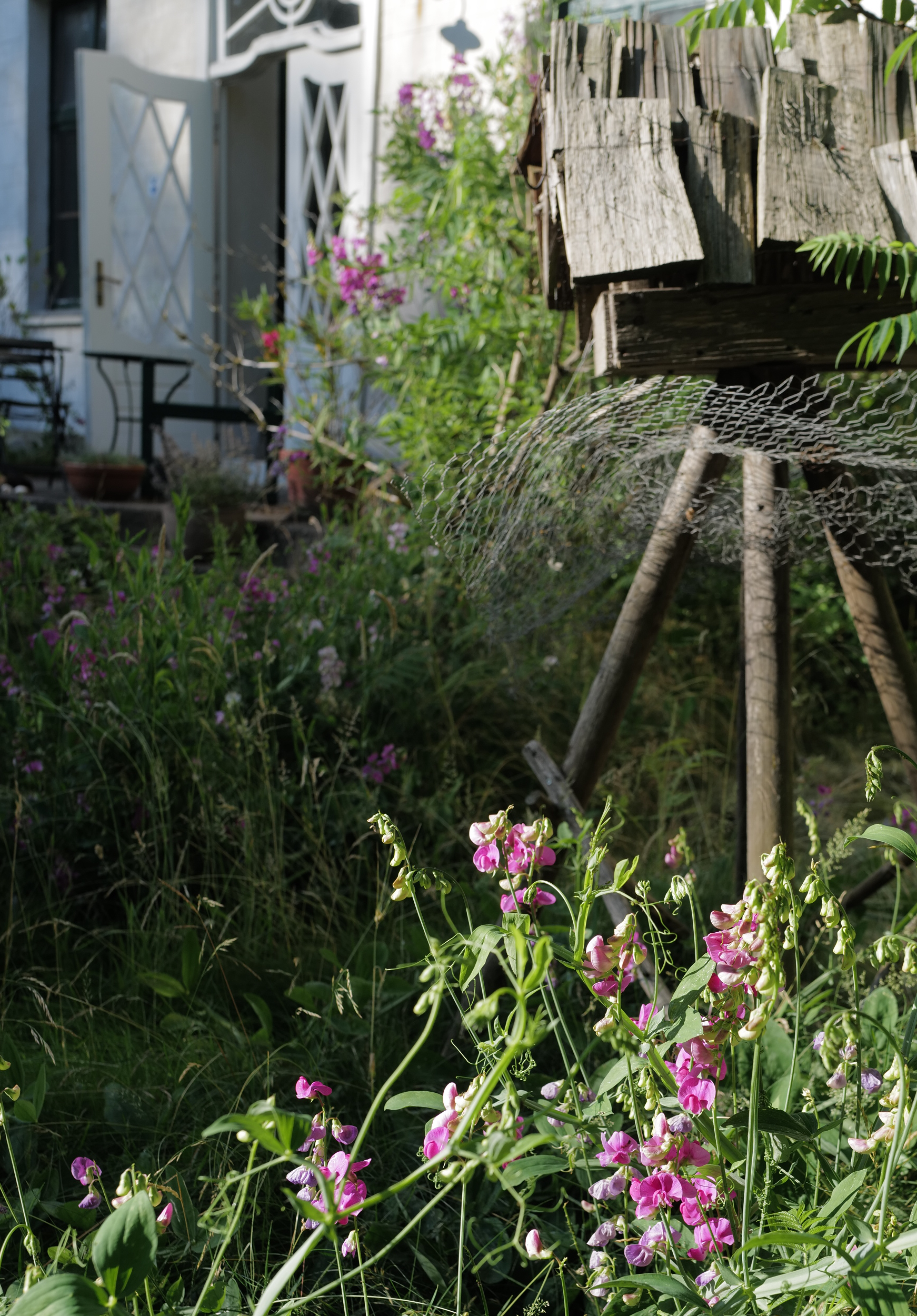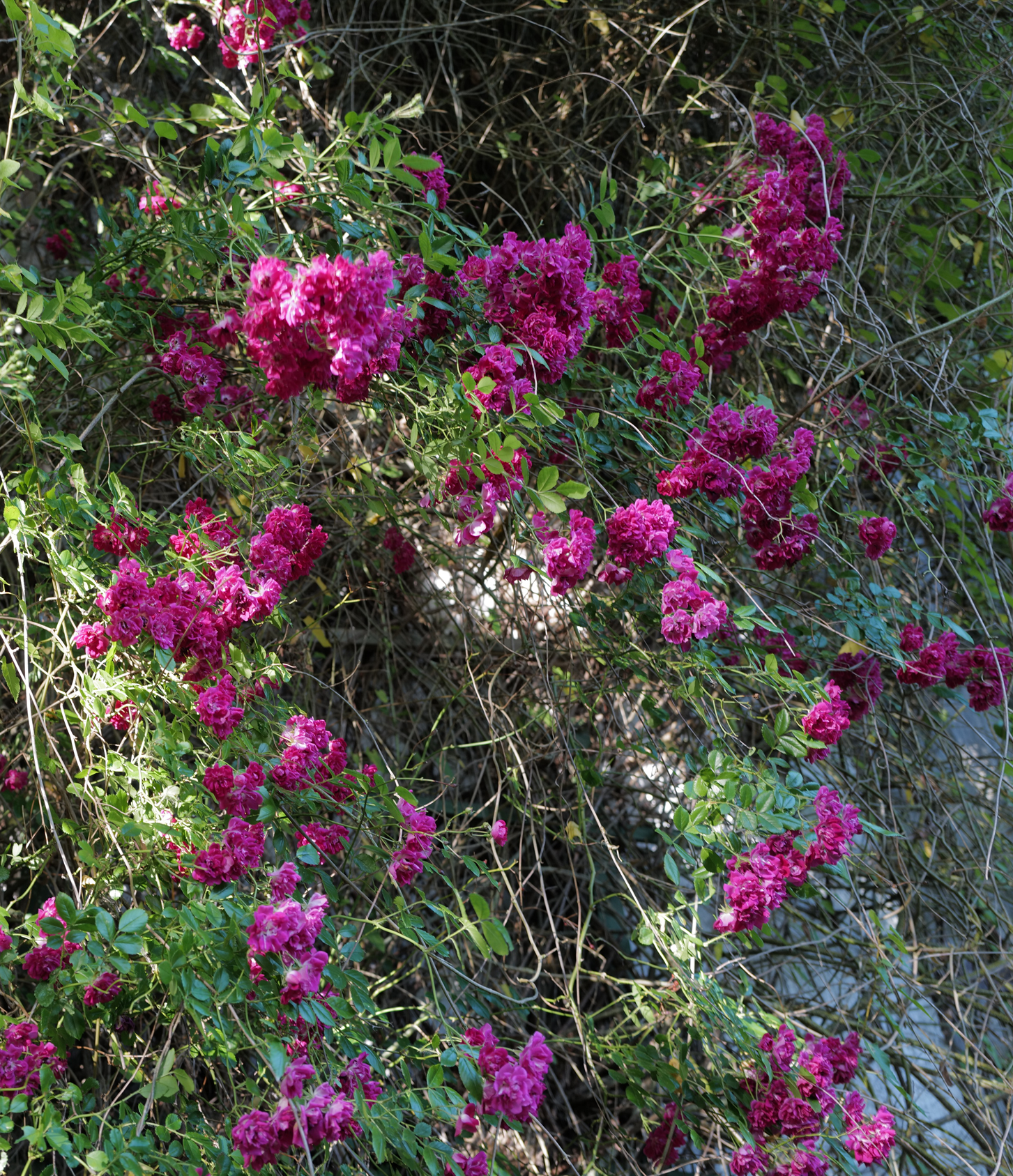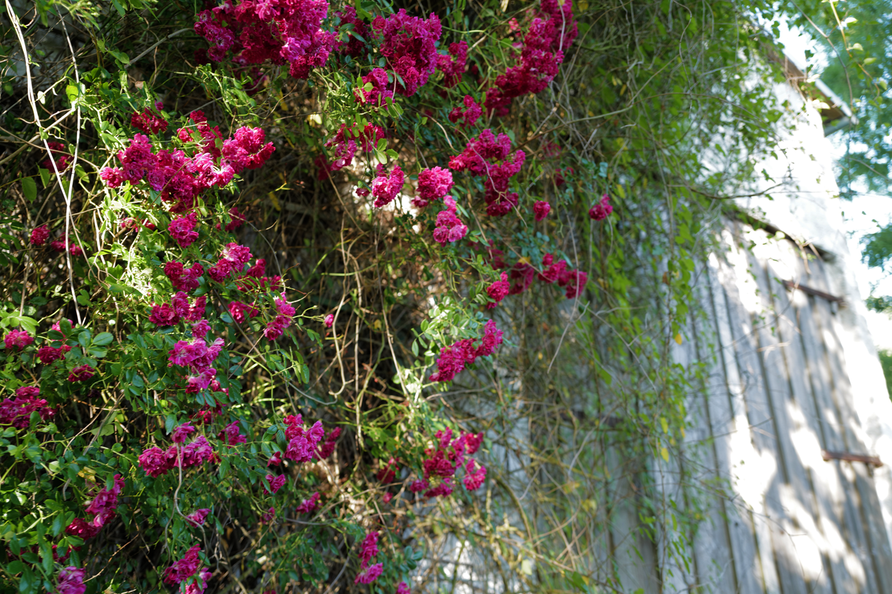 und wo früher die Scheune war für das Stroh und Heu der Pferdeställe und Schweine, mit den Höhlen drin für uns Kinder, nun die Rosenwand