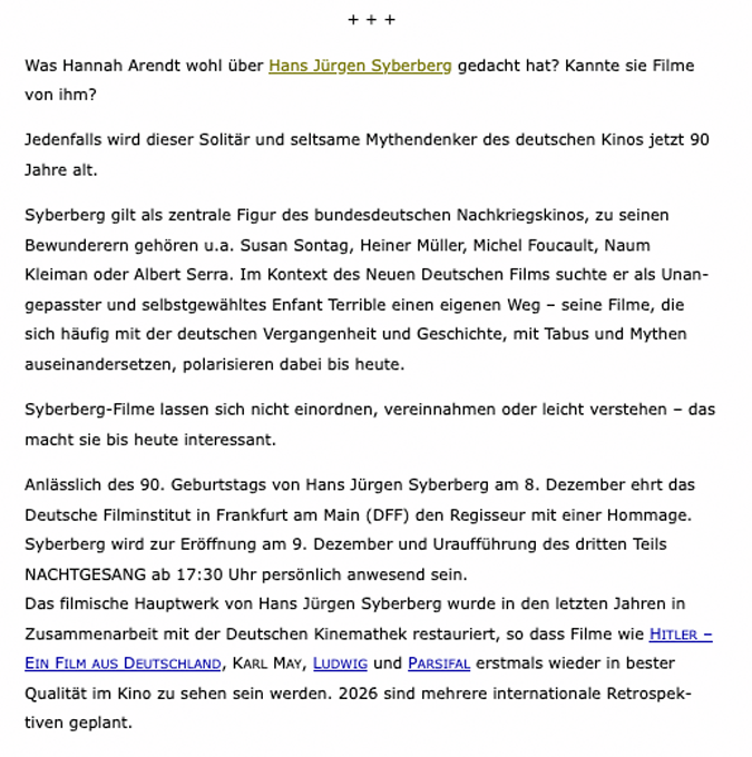 Mythendenker das kommt aus der Wahl der Darstellungen. Im Studio der Projektionen und deren Bilder und Töne/RW gegen die Realität des Alltags zu arbeiten(Ludwig und Hitler mit einem Karl May in der Mitte). Und so im Kopf der Totenmaske RWs die Suche nach dem Gral? Ein Nach Mitternacht Kino im FS. Aber dann 6 Stunden DIE NACHT als Monolog des Theaters der anderer Welten. Und ein N. gegen die Natur -zerstörung als Artefakt, woraus ein neuer Film enstand als Befreiung aus fremden Besetzungen. Alles zentral aus tödlichen Umarmungen.