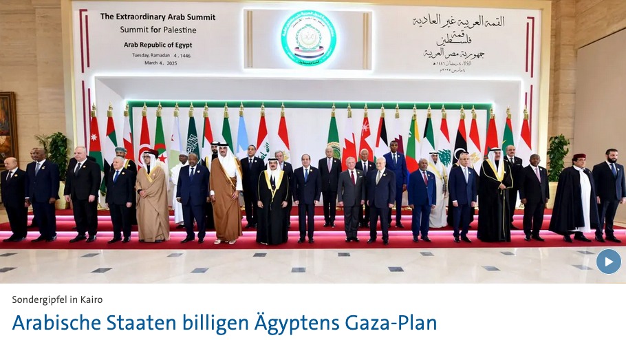 US-Präsident Donald Trump hatte vorgeschlagen, Gaza in eine „Riviera des Nahen Ostens“ zu verwandeln und die rund zwei Millionen Palästinenser und Palästinenserinnen nach Ägypten und Jordanien dauerhaft „umzusiedeln“. Die UNO warnte daraufhin vor einer „ethnischen Säuberung“. Trumps Pläne hatten in der arabischen Welt und darüber hinaus Empörung ausgelöst.