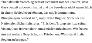 Ob und wann der Plan umgesetzt werden könnte, ist völlig offen – auch weil die Waffenruhe in Gaza auf der Kippe steht und der Krieg zwischen Israel und der radikalislamischen Hamas neu entflammen könnte. Zudem sind neben der Finanzierung viele weitere Fragen ungeklärt, etwa zur Zukunft der Hamas und die Frage, wer das Gebiet künftig kontrollieren und sichern soll.
