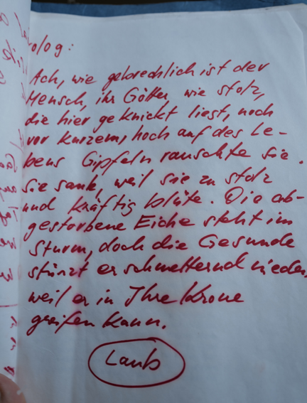 gef. beim Aufräumen. handschrifliche Eintragung von Sylvia Herzinger(Suffleuse)vor der Marquise auf dem Theater. In ihr Textbuch aktuell eingefügt als Prolog