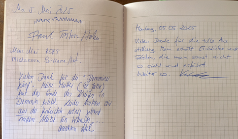 Die Installation im L.Speicher und die Lesung der Namen aus dem Buch der Toten 1945 Demmins in der Kirche St.Bartlom. sowie der Markt mit seinem Kellergang aus Bäumen nun der Bürger selbst über dem Markt auf dem Totenacker des Brandes machen zusammen ein Demmin 80 Jahre nach dem lezten Krieg, das jene ernstnimmt, die damals darin umkamen. Selbst zum Gesang werdend. In der Nachfolge. Vom Schwanengesang zum Gesamtkunstwerk eines Weltgewissens.