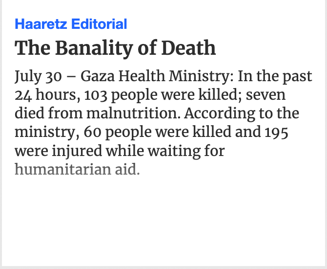 30. Juli: Das Gesundheitsministerium von Gaza: In den vergangenen 24 Stunden wurden 103 Menschen getötet, sieben an Unterernährung. Nach Angaben des Ministeriums wurden 60 Menschen getötet und 195 verletzt, während sie auf humanitäre Hilfe warteten.