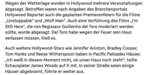 Den Einsatz beschrieb Crowley als „extrem schwierig“. Auf einigen Straßen von Pacific Palisades, einem wohlhabenden, an der Pazifikküste gelegenen Stadtteil von Los Angeles, spielten sich chaotische Szenen ab. Der Verkehr kam zum Erliegen, Autos steckten im Stau fest. Einige ließen ihre Fahrzeuge zurück und brachten sich zu Fuß in Sicherheit. Mit Bulldozern habe die Feuerwehr abgestellte Autos aus dem Weg räumen müssen, um mit ihren Löschwagen weiterzukommen, berichtete der Sender KTLA.