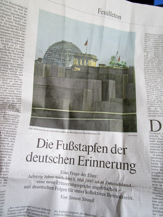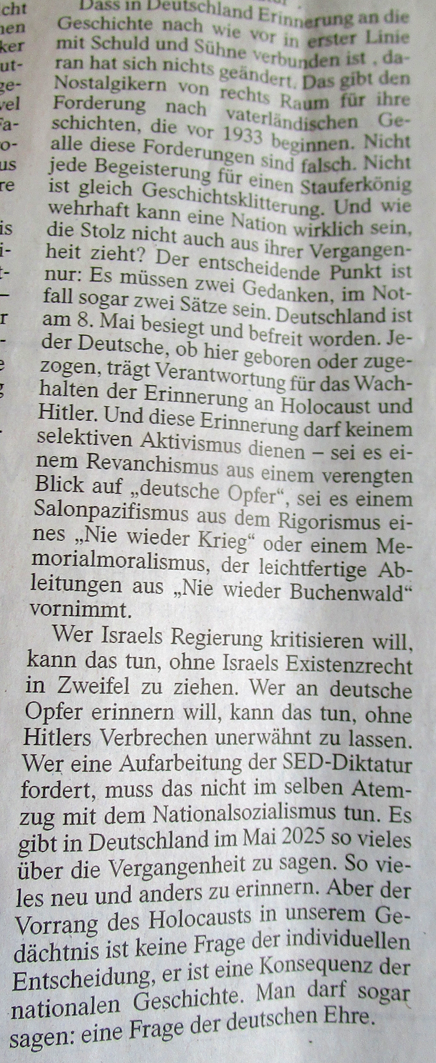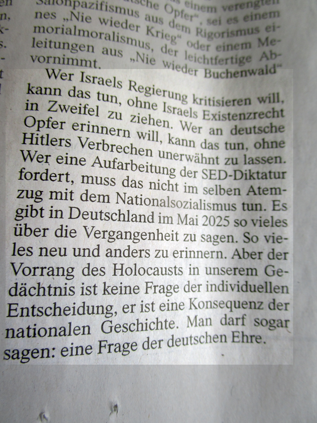 So schreibt ein deutscher Intellektueller aus klugem und belesenem Haus 80 Jahre nach Kriegsende zum 8. Mai, unter diesem Foto aus dem Hinterhof und den Parks der ehemaligen Regierungszentren in einer der führen Zeitungen, hier im Zusammenhang mit einem Palästina, das sich seitdem Israel nennt als Hoffnung der Welt. Tief verstrikt in Kriege und mehr als das.