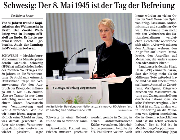 Auch die Namen der Toten der SU aus dem WoldeForst /Munitionsfabrik von Peenemünde) würden -wie überall angesagt- vorgelesen. In der Demminer Zeitung ohne Bericht. Zum 1. Mal keine bunten und schwarzen Demonstrationen auf den Strassen der "Befreiung".