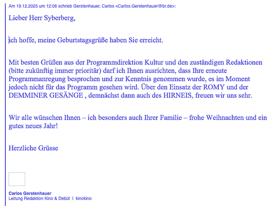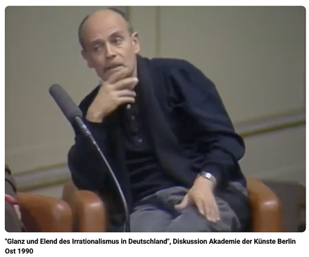Das Tribunal 1990 in Berlin, der Akademie noch im Osten -von einem damals notwendigen Buch ausgehend- war eine Zäsur in diesem Universum. Der Gang in den Osten, an den Rand, nach zehn Jahren, wieder an den Ort der ursprünglichen Herkunft in verändertem Umfeld weltweit heute 35 Jahre später, brachte ungeahnte Stoffe und Ästethiken für Filme, hier wieder ungewollt, auf schmaler Basis einer Not Wendigkeit ganz anderer aktueller Universalität aus dem Kern der Dinge.