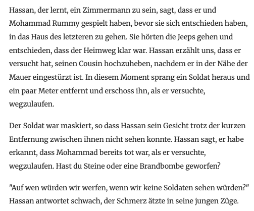 geschah. Als ein Israeli "Massaker" sagte, meinte er das Massaker an Israelis, als ob er sagte, dass es kein anderes gäbe. Das Wort Massaker wurde zu einem angespannten, tendenziösen, Propaganda dienenden und damit, soweit es mich betraf, aufgrund seiner einseitigen Bedeutung zur Verwendung disqualifiziert.