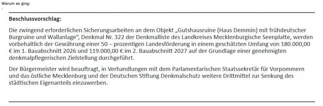 Heisst jetzt: Bleibt so wie es ist Ruinen und wird was Park ist und Geschichte plus Denkmal an allen Eingägen abgesperrt(zu Brücke und Zugänge von den Walleingängen für Spaziergägern)