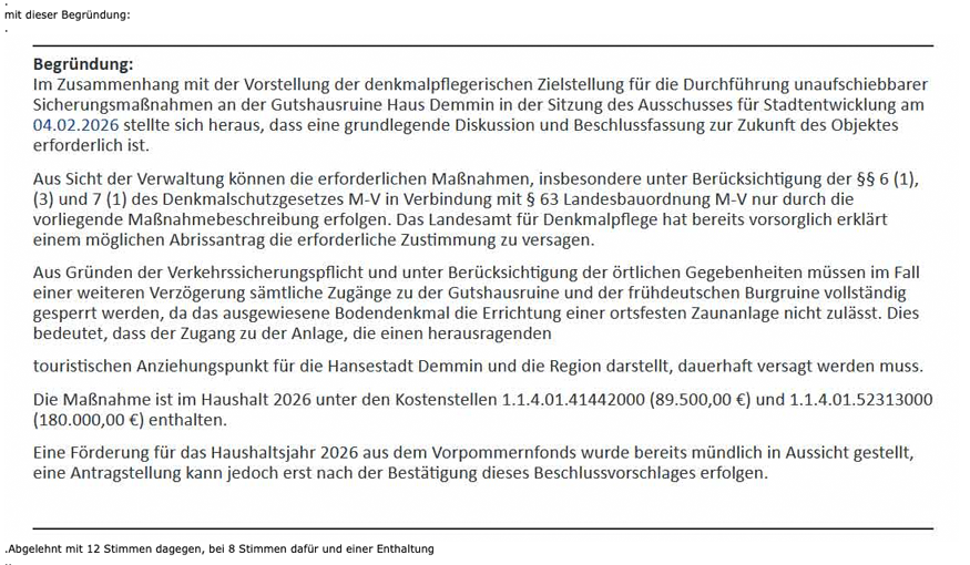 Heisst: Die Stadt Demmin hätte 180 000