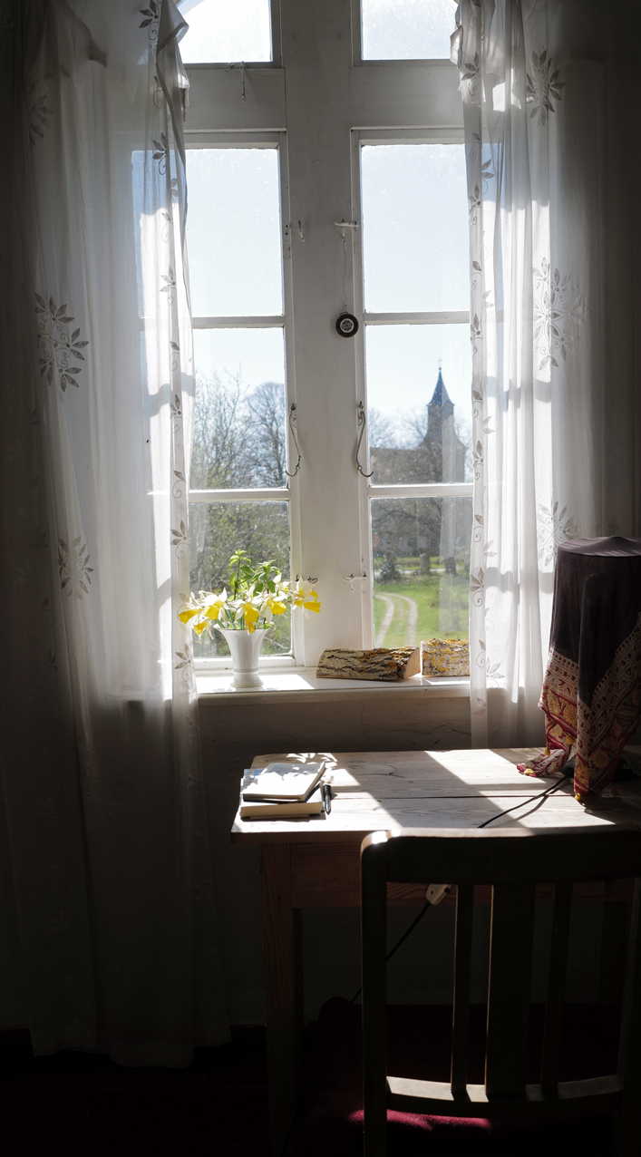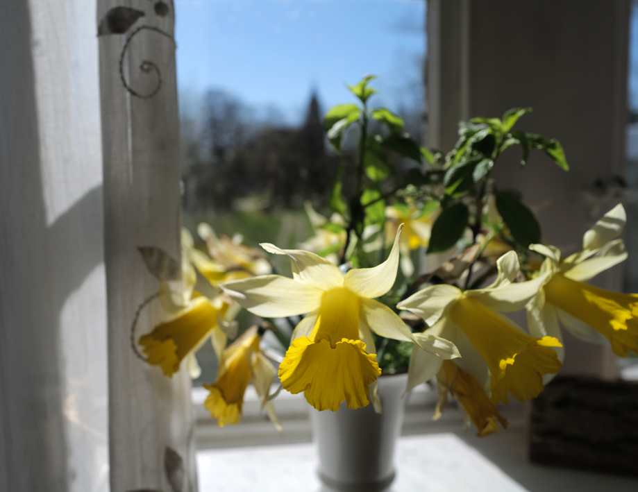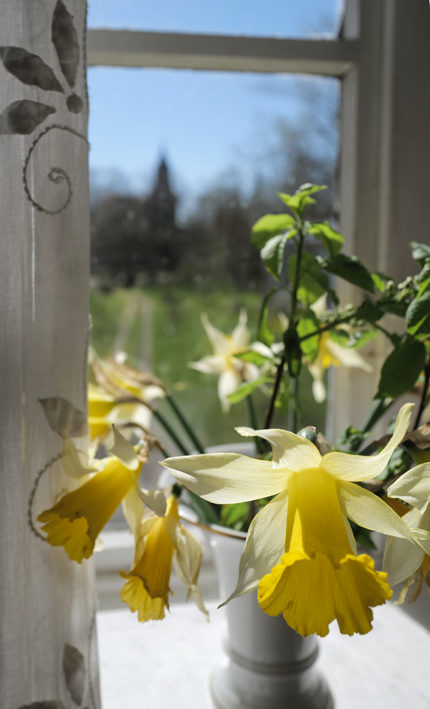 Dieses Fenster, als erstes mit der Rückehr nach 1947 im Jahre wieder hergestellt und nach Paris gebracht um es im Centre Pompidou 2003 auszustellen, markiert die Situation. Hier nun mit dem wiederhergestellten Turm der Kirche und Blick über den Hof durch einen Park von Bäumen als einen Weg durchs Tor hinaus in die Welt, als freundliche Antwort erster Blumen das Jahres auf das, was inzwischen gesc81 Jahre danach. Nach dem Zusammbruch 1947.
