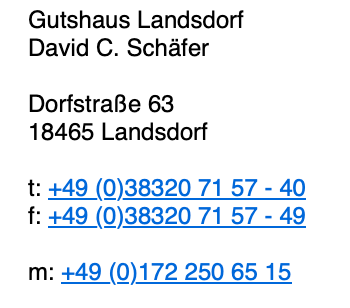In Landsdorf 40 Minuten mit dem Auto nördlich von N. an der Trebel Richtung Rostock an der Auobahn zur Besprechung der nächsten Aufführung der Demminer Gesänge mit NachtGesang am 8. Mai nun festgelegt mit Uhrenzeiten und Ablauf der Pausen für die Einladungen von 17 Uhr bis Mitternacht inklusive 2x 30 Minuten-Pausen.