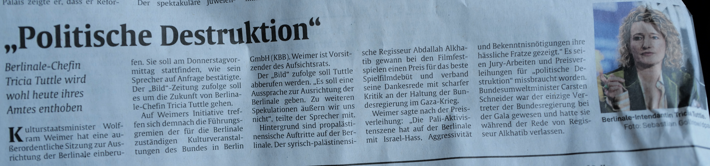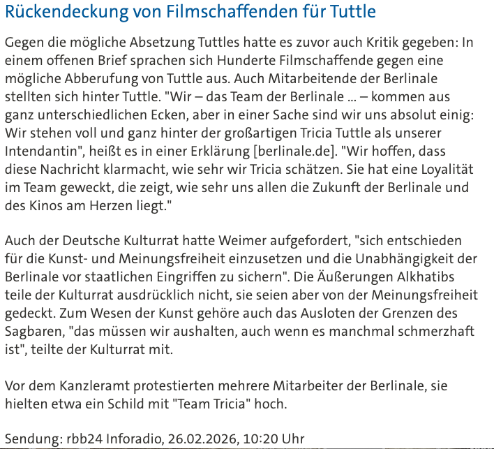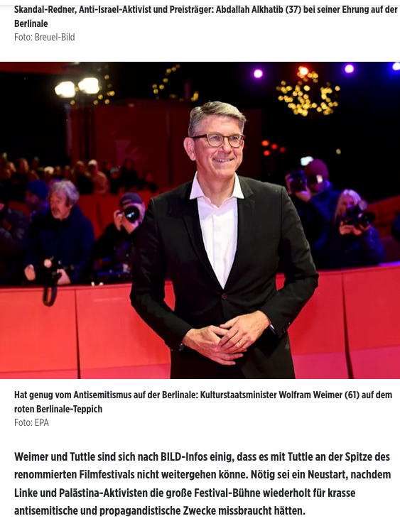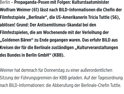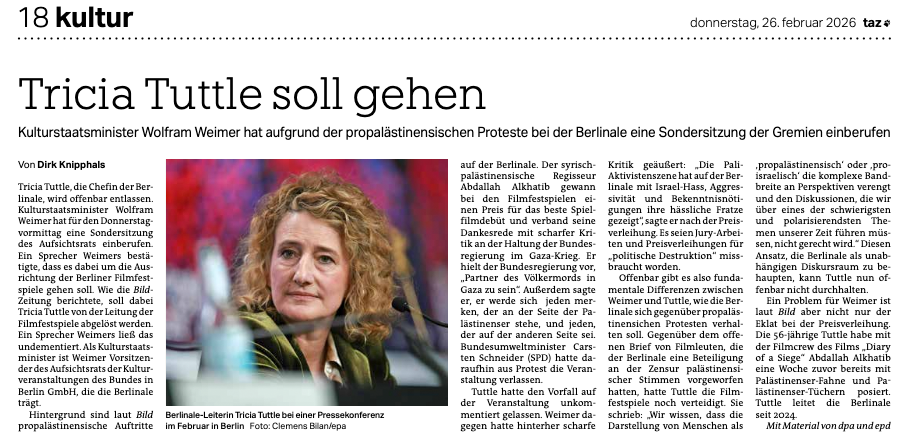 Der deutsche Kulturminister berief am Donnerstag eine Vorstandssitzung des Berlinale Board of Directors ein, nachdem die politische Gegenreaktion auf pro-palästinensische Äußerungen bei seiner Schlussfeier Spekulationen angeheizt hatte, dass Festivaldirektorin Tricia Tuttle entfernt werden könnte - ein Schritt, der schnelle internationale Industrieproteste auslöste.
