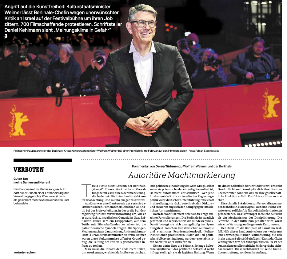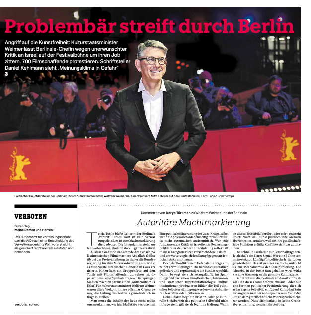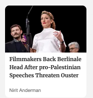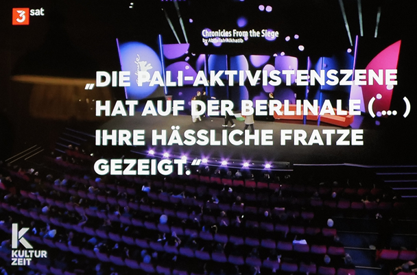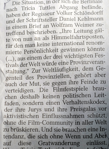 und von deutscher Seite dass nie wieder Berlinale mit ihm, wenn das sein soll, die Leitung der Berlinale wieder zu entlassen