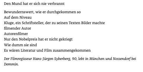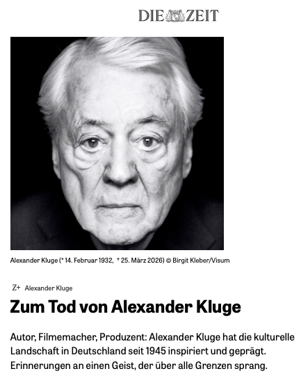 In der ZEIT ein paar Stimmen, anrührend und nahe. So von Edgar Reitz seit früher Zusammenarbeit bis zuletzt, Rohrbach vom FS/WSR kundig und getreu, Schlöndorff ja.