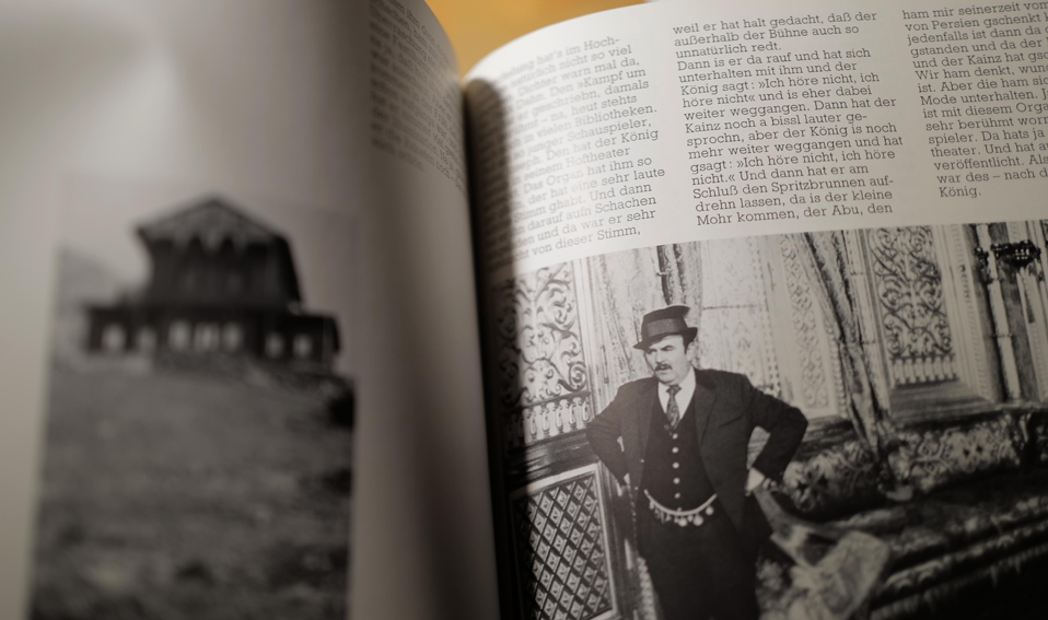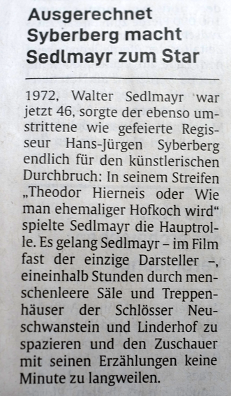 Alles nur einmal aufgenommen, Aufnahmen zwischen den Führungen eingequetscht, ohne Stativ und ohne Wiederholungen, schnell schnell nicht aufzufallen, und als lästig rauszufliegen, Drehzeit 3 Wochen von morgens 5 Uhr aufstehen mit Auto und persölichem Chauff. abholen, eine Stunde zusammen Bettkannte vorher, so ab 16 Uhr Dreschluss wieder nach München im Taxi ins Theater für Kleinkunst-Rollen, keine Textfestigkeiten, nicht firm, Horror, dafür Umschreibungen des Gelesenen in Statisten- Sprache eines Königsdramas, der Witz war ad hoc zu erfinden. Der Spezifische Sedlmayr-Sound seitdem. Mit Forderung seinerseits für Drehbuch-Entgelt, Exrtrahonorar statt Strafe, bis Arbeistverweigung und Anrufung seines Anwalts (N.Kückelman, rettend den Film, im Madonnen- Raub Prozess ihn vertretend, nun als Film- Kollege vermittelnd in dieser erpresserisch gefährdenden Alles-Stopp-Situation mitten im Gallop). Schwur des Niewieder. Schwere Geburt-leichtes Kind. Eine Komödie zur Tragödie, aus der Küche geplaudert eines Märchen-Königs. Die Königsgeschichte seiner Schlösser. Dazu viel Richard Wagner aus dem Ludwig in die Küchen des Königs hineingemogelt. Authent. Datteltörtchen aus den org. Hierneisbuch gerettet in jedes Weihnachten als Hausgebäck privat.