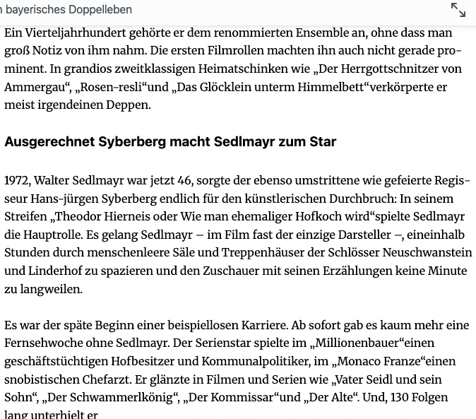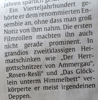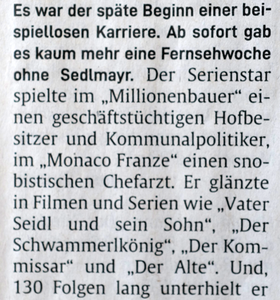 "Spiel-Film und Dokumentarfilm"genannt. Das muss (wem?) einfallen. Heisst wohl Dokument des W. Sedlmayr oder der Schlösser ohne künstliches Film-Licht. Selbst der orig.Text vom alten Hierneis war von uns teilweise umschrieben, gespielts von einem Sedlmayr wie sonst nie. Vorher nicht und nachher nicht. Und das wusste er auch immer mit Dank. Wie er sein wollte. Seine Lebensrolle. "Ausgerechnet .... wer sonst.