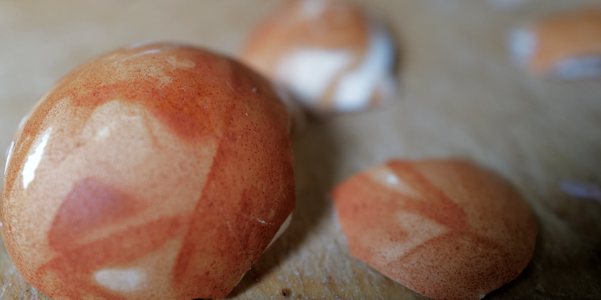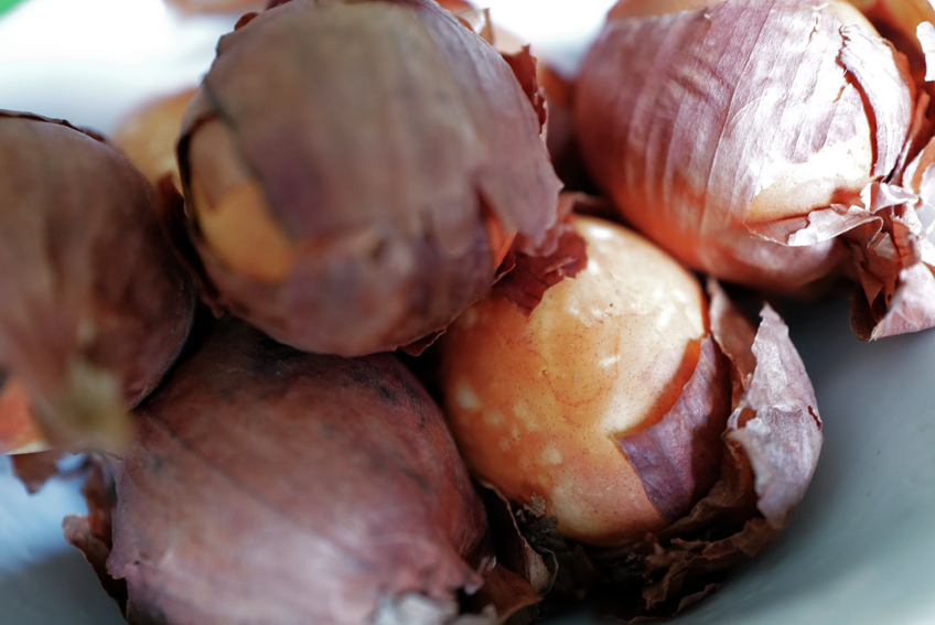 Am Ende ohne Blätter der Zwiebel, allein um übriggebliebenen Sud gefärbt mit Falten des umhüllenden Stoffes einzefasst.
