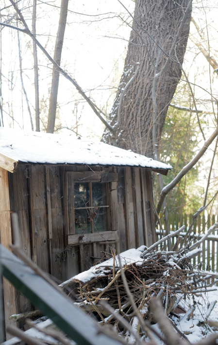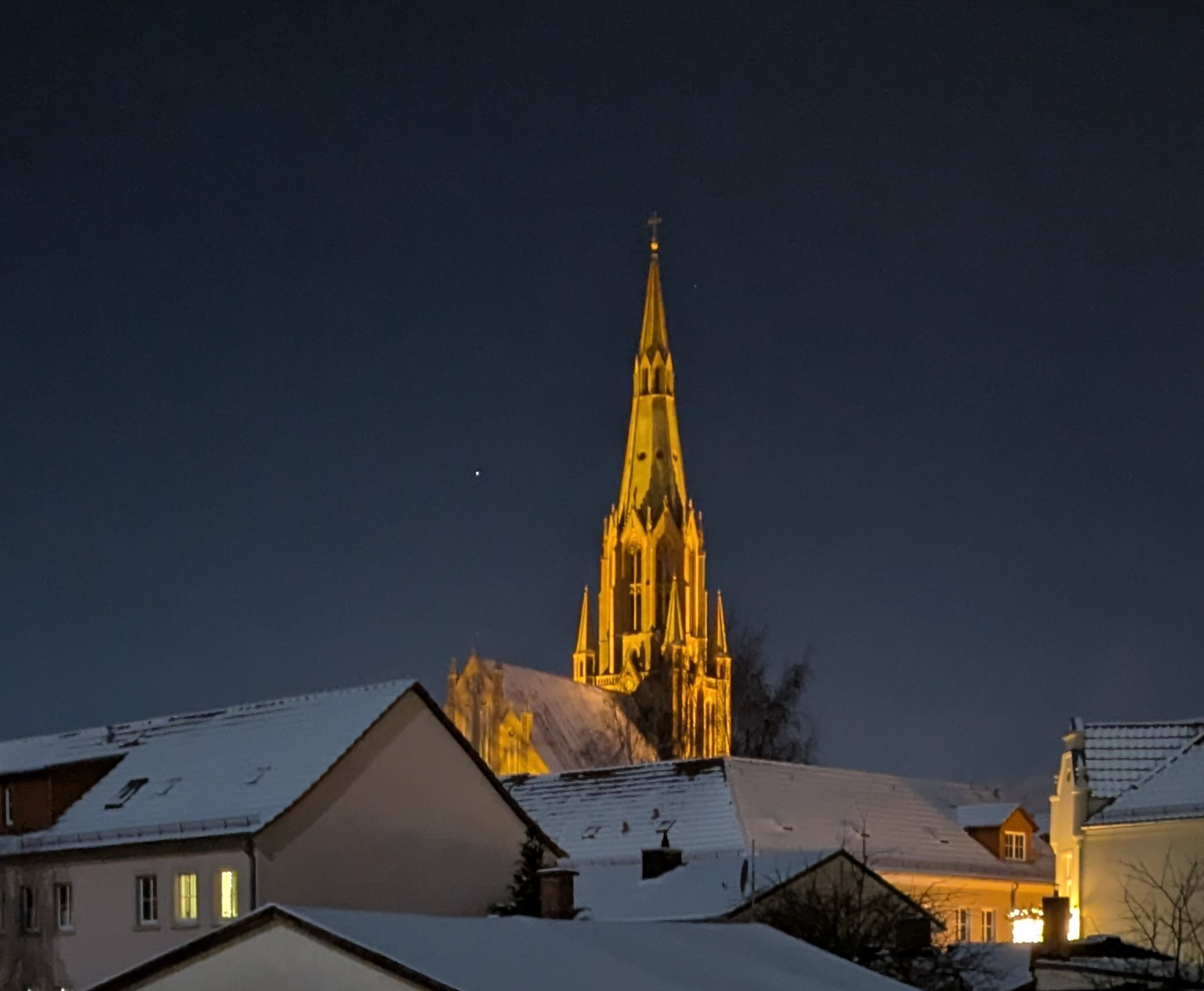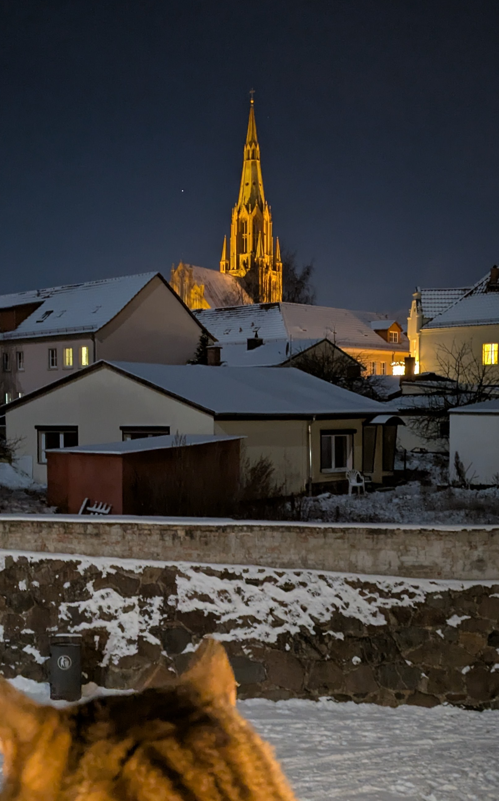 Man sieht hier den Weg rechts zur Trebel. Oben die Lichter am Tisch unten und Oben im Giebel.