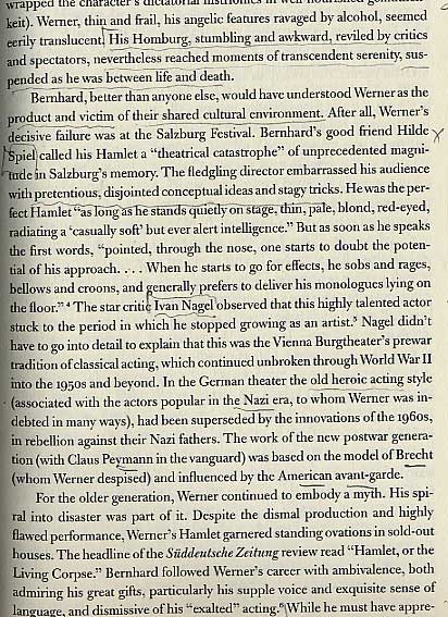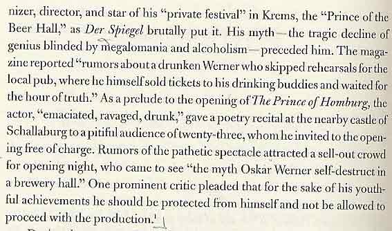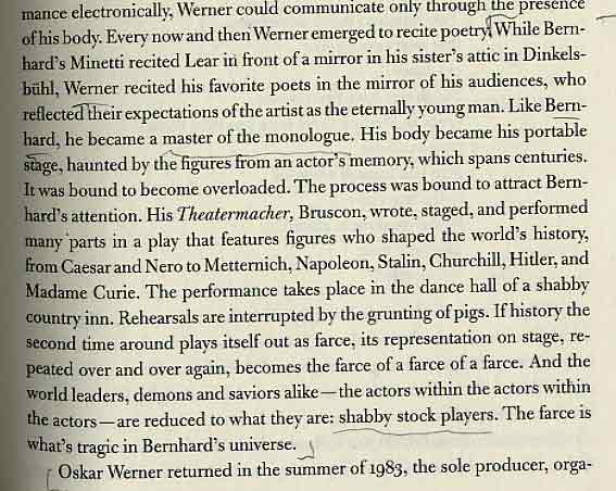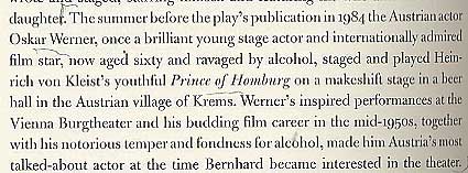 Dargestellt wird in Kaptitel 12 (Questioning of Genius) eine geistige Verbindung Bernhards zu Oskar Werner. Sein Abgang von der Bühne 1970 nach den mörderischen Kritiken in FAZ(Hilde Spiel) und SZ(Ivan Nagel) mit letalem Ausgang nach 13 Jahren. Rückzug in den Bergen, Alkohol und Vereinsamung. Mit nochmaliger Rückkehr ein Jahr vor dem Tode, der Aufführung des Homburg in Krems vor Wien 1983, gegen das von Nagel und Spiel etc protegierte Regietheater der Peymann und Stein etc. und erneuter Hetzjagd in Wien und im Spiegel (S.Löffler), und aller anderen aus dem Wiener Sumpf (Kathrein/Kurier und Endler/Die Presse inbegriffen), unter dem Hohngelächter A. Hellers von der Premiere kolportiert und erzählt, den endgültigen Todesstoss empfangend. Er, die junge Symbolfigur "des alten Stils", um mit Beckett( in den Glücklichen Tagen) zu sprechen, wurde erledigt. Und damit eine Kultur. Nicht nur des Theaters.
