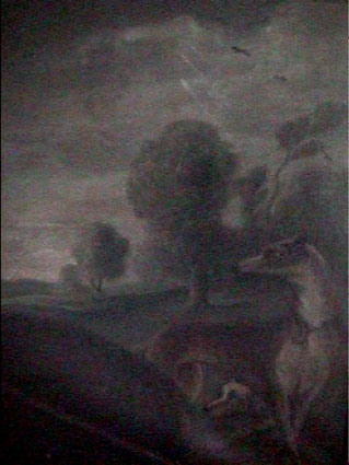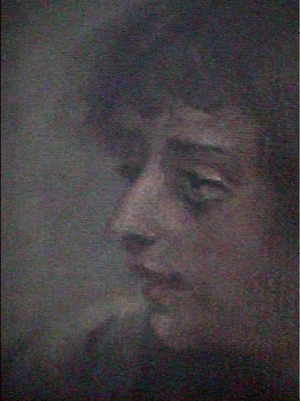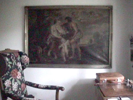 Im kleinsten Raum des Hauses, so gross wie das Kinderzimmer in N., für Bett, Schrank, Tisch und Ofen.Aber das Licht von Osten, am Morgen, durch das Grün der Blätter gefiltert. So ist es richtig. Nun überleagert von Staub und Seeluft auf dem Dachboden in Rostock, dort über 2o Jahre, vor der Reinigung also und alles noch da, intakt, bis auf den Rahmen.