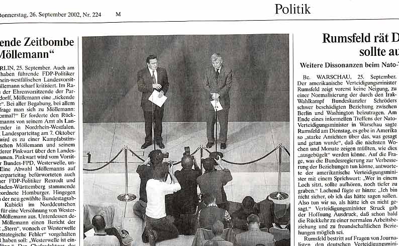 Um seine Pointe zu verstehen, muss man ihn ausführlich zitieren: „Bis tief in die Ära Kohl hinein“, erläutert er zunächst, „bis tief in die Ära Kohl war deutsche Außenpolitik von dem Bewusstsein geprägt, dass wir uns auf einer Sonderschule der Demokratie den Abschluss erst mühsam erarbeiten mussten. Schröder war, wenn man so will, der erste Kanzler der Normalität. Mit seiner Wahlkampfwendung vom deutschen Weg wurde sozusagen die Heimkehr der deutschen Demokratie in die Familie der nicht neurotischen Gesellschaften gefeiert. Darüber sind die ideologischen Sozialarbeiter und politischen Psychotherapeuten der Deutschen naturgemäß unglücklich, weil sie einen Patienten verlieren, an dem ihnen sehr viel lag und der sich so leicht nicht durch einen anderen ersetzen lässt. Schröders ,deutscher Weg‘ besticht vor allem auch durch die Selbstverständlichkeit seines Klangs, weil man weiß, dass hier kein Chauvinist oder Anti-Europäer spricht, sondern einer, der ganz deutlich signalisiert, dass im Bereich der deutsch-amerikanischen Beziehungen ein neues Kapitel aufgeblättert werden muss. Die Fähigkeit, zwischen den USA als kulturell verbündetem Projekt und der Bush-Administration zu unterscheiden, halte ich für eine elementare Tugend der deutschen Demokratie von heute.“