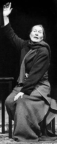 Doch Edith Clever spielt nur das Lamento einer einsamen Greisin mit Helene-Weigel-Frisur und stilisiertem Proletenkostüm. In pathetischem Halbdunkel, durch funzeliges Scheinwerferlicht ins Heiligmäßige entrückt, deklamiert sie einen Text, der sich zum Deklamieren eignet wie ein Regenschirm als Krinoline. Aus Schleefs schroffer Poesie sollen goldene Worte werden, deshalb spricht Edith Clever mit ganz spitzem Mund, veredelt das "Ich" zum "Üch", das "Glänzen" zum "Glönzen", lächelt süß bei "Kindheit" und senkt den Kopf an traurigen Textstellen. Was Drama, was Figur war, zerbröckelt in zusammenhanglose Wörter. Ohne Geschichte kann es aber keine Gertrud geben; sehr geholfen hätte auch eine leise Ahnung von Schleefs Landwüst, jenem ödem Allerweltsbezirk, den noch andere Dichter beackert haben: Volker Braun hisste hier Rauchfahnen, Heinz Czechowski lief hier im Kreis, Schleefs Bande steckte in qualmenden Autokolonnen fest. Disparate Gegenden waren das, aber immer Welten. Seelische, philosophische, politische, anschauliche. In Schleefs Sprache poltert Luther, singt Klopstock, und Nietzsche wohnt gleich nebenan. Am BE dagegen ist nur hohle Prätention, affektierte Gebärde. Viel Pietät, aber kein einziges Paar Gummistiefel.